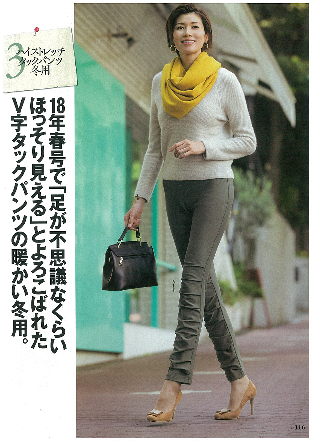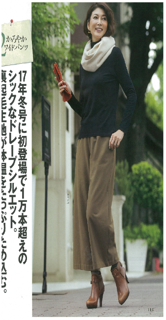 裏起毛生地で広がりすぎない「かろやかワイドパンツ」と、膝上から足首まで左右9本ずつタックが入った、足が不思議なくらいほっそり見える「ハイストレッチタックパンツ」です。