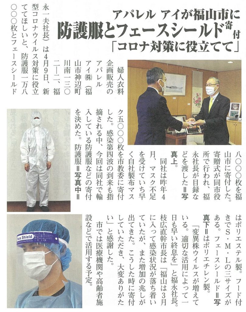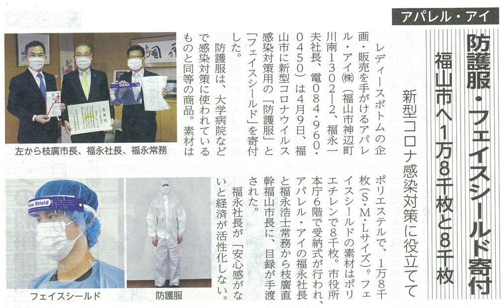 2021.05.14 2025.12.13 「CHUGOKUビジネス情報」「経済リポート」へ掲載されました。 4/20付CHUGOKUビジネス情報・4/20付経済リポートへ福山市へ防護服・フェイスシールドを寄付した記事が掲載されました。 CHUGOKUビジネス情報 経済リポート